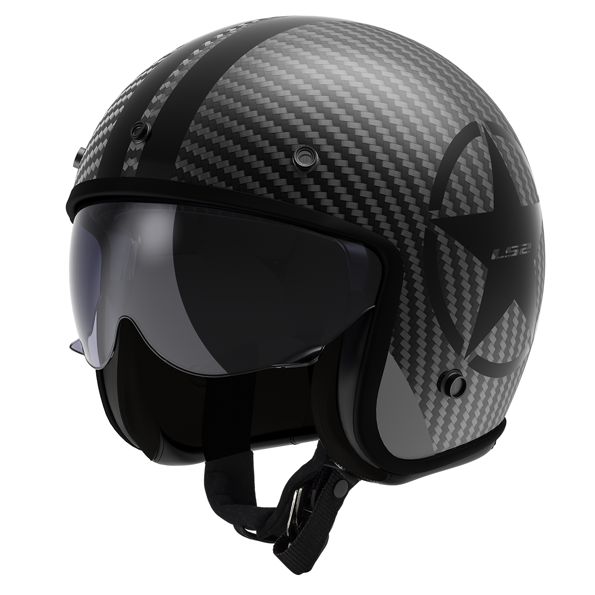 Exkluzívna ľahká karbónová helma v luxusnom neo-retro vzhľade, integrovaná slnečná clona, celokarbónová škrupina z krížovo tkaných uhlíkových vlákien, odnímateľný slnečný štítok, komfortný, antibakteriálny, kompletne vyberateľný a prateľný interiér, zapínanie dvojitými D-krúžkami, hmotnosť iba 8